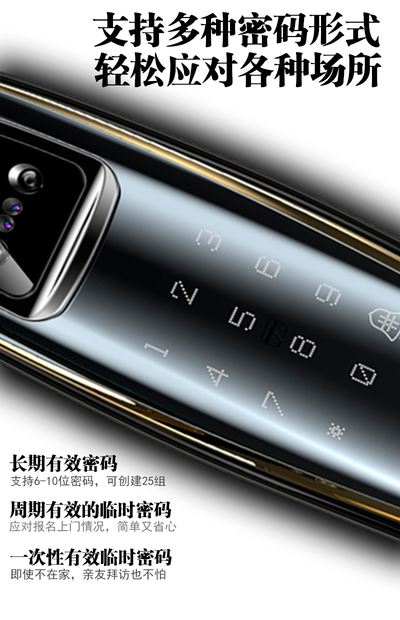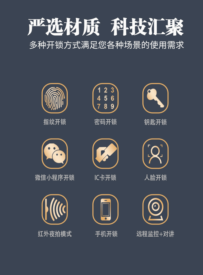 嚴(yán)格挑選材質(zhì),多項(xiàng)科技技術(shù)匯聚,多種開鎖方式滿足您對(duì)日常各種環(huán)境的使用需求,3D人臉+貓眼,智享幸福生活!